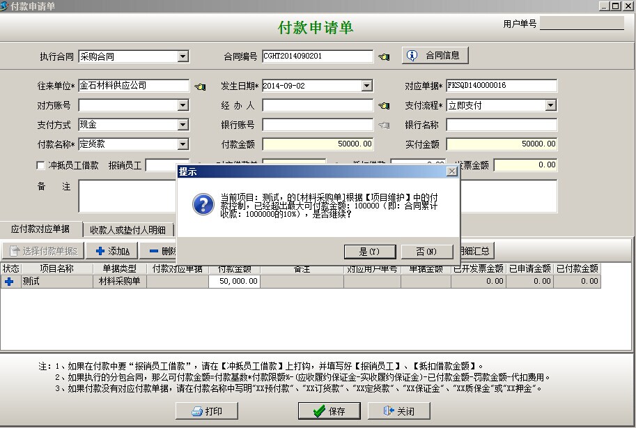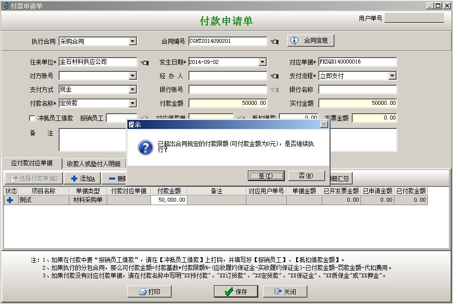 彈出付款申請單,付款名稱自動默認材料設(shè)備款+預付款,付款明細是自動帶入的,選擇支付方式點保存,會出現(xiàn)提示窗口根據(jù)下面截圖進行選擇繼續(xù)。