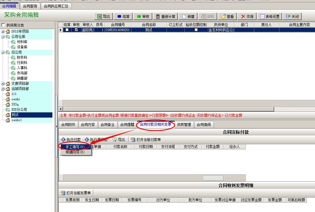 合同內(nèi)容錄入完畢,審核采購合同,在沒有執(zhí)行到貨驗收的情況下,點擊合同付款及相關(guān)發(fā)票,執(zhí)行付款,選擇手工填寫,彈出付款申請單,選擇付款方式,付款明細中輸入付款金額,然后保存 。