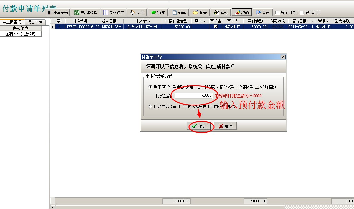 審核付款申請單之后,執(zhí)行付款,這樣第一次預付款申請就錄入完成了。申批通過后、付款時再做【付款單】,具體操作不再演示。