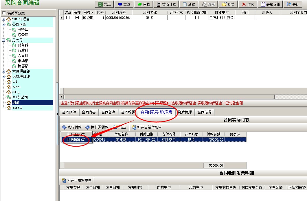 如果再有付款的情況,我們做【采購合同】->【合同付款及相關(guān)發(fā)票】->【到貨驗收】->【合同付款】->【根據(jù)向?qū)А俊?/span>