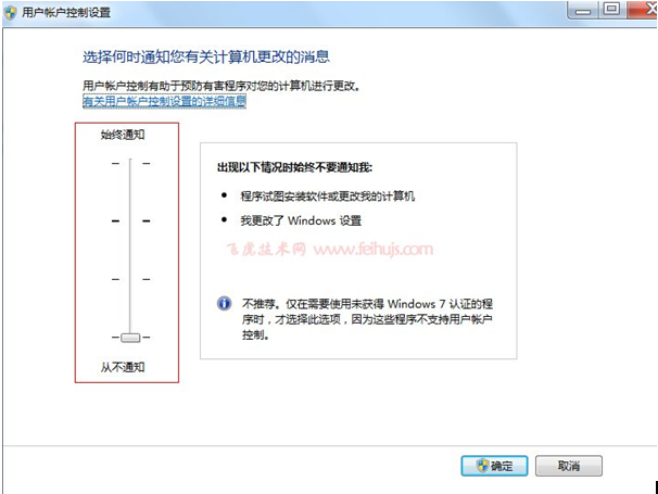 在用戶賬戶設(shè)置界面,把下圖紅色區(qū)域拖到最底,確定后,重啟電腦