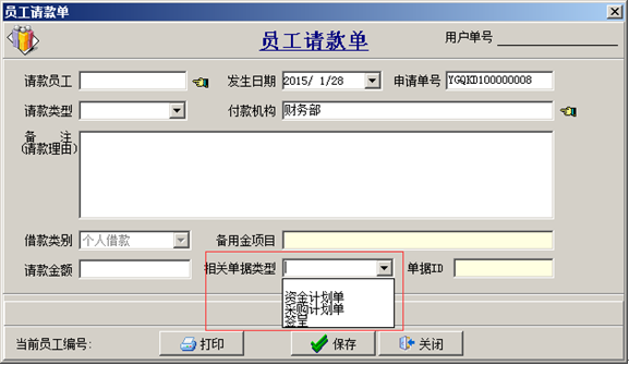 這時(shí)的【員工請款單】較為簡單,只提供了備注、與附件功能,給審核該單據(jù)的管理人員造成了一定的難度。為了解決這一問題軟件改進(jìn)了【員工請款單】給請款單中增加了三個(gè)來源:【資金計(jì)劃單】、【采購計(jì)劃單】、【簽呈】,以方便在員工請款審核中,查看請款理由是否合理。其中【采購計(jì)劃單】和【簽呈】是軟件中一直存在的模塊,直接關(guān)聯(lián)的計(jì)劃單號和簽呈單ID。