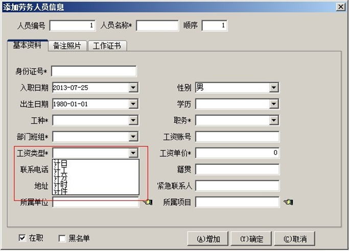 2. 【勞務(wù)工資】可用于統(tǒng)計(jì)公司非固定的工作人員,或其他勞務(wù)公司的工人工資,勞務(wù)工資計(jì)算方式可選計(jì)日、記工、計(jì)分、計(jì)時(shí)、計(jì)件(在添加勞務(wù)人員信息時(shí)設(shè)置)。