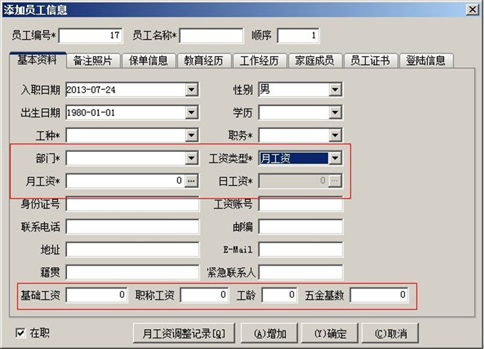 員工工資的計(jì)算方式有月工資和日工資兩種方式(在員工維護(hù)中設(shè)置),按月工資計(jì)算時(shí)工資不受考勤影響,按日工資計(jì)算時(shí),員工工資等于日工資乘以考勤天數(shù)。以上計(jì)算得出的是應(yīng)發(fā)工資,用戶還要根據(jù)自己的實(shí)際情況來編輯公式,得出實(shí)發(fā)工資。下圖所示:?jiǎn)T工維護(hù)中有每個(gè)員工固定的月工資、日工資、基礎(chǔ)工資、職稱工資等。
