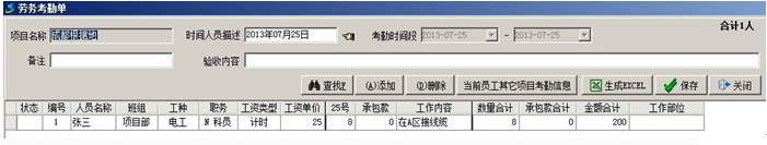 在勞務(wù)考勤中,記錄的內(nèi)容主要包括:當(dāng)前日期的出勤情況、工作內(nèi)容。如下圖所示:?jiǎn)T工張三在7月25日,考勤數(shù)為8,工作內(nèi)容為,在A區(qū)接線纜。他的工資類型屬于計(jì)時(shí),所以8代表8小時(shí),他當(dāng)天的工資為:25乘以8=200。除正常的考勤外還有承包款一項(xiàng),一般是記錄員工當(dāng)天的補(bǔ)助或加班費(fèi)等。