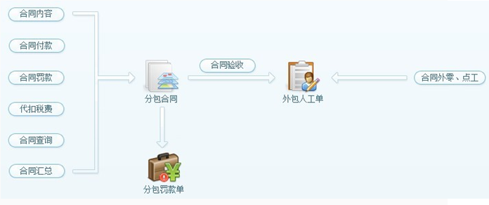 3. 【分包費(fèi)】可用于統(tǒng)計(jì)專業(yè)分包產(chǎn)生的成本及臨時(shí)雇用的零工成本。如軟件流程圖所示:分包成本是由外包人工單產(chǎn)成,其來源可分為兩部分,第一:來自分包合同中的合同驗(yàn)收,第二:來自合同外零、點(diǎn)工驗(yàn)收。