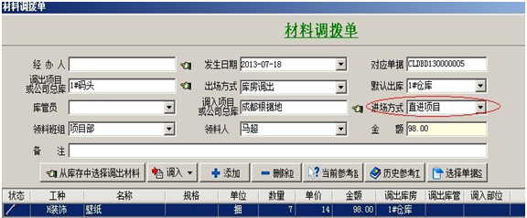 3. 【材料調撥單】主要用于:項目與項目之間的材料調撥,或公司總庫與項目之間的材料調撥。在填寫時要選擇好調出項目和調入項目。調出項目有兩種出場方式:庫房調出和班組繳料,調入項目有兩種進場方式:調撥入庫和直進項目。進場方式選擇直進項目時,明細中的材料金額會進入調入項目的成本中。如果調出項目,出場方式選擇的是班組繳料,也就是從項目現(xiàn)場直接調出的,這時調出項目的成本中會減去明細中材料的金額。