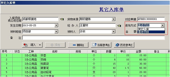 1. 【其他入庫單】一般用在期初庫存輸入或材料來源不牽扯應付賬款的情況。在填寫其他入庫單時進場方式選擇:直進項目,那么單據(jù)明細中材料的金額會直接進入單據(jù)所選擇的項目成本中。如果選擇了其他入庫,那么這批材料的金額不會直接反映到項目成本中,這批材料必須出庫后才會進入項目成本(這批材料的成本以出庫時所填寫單據(jù)中的金額為準)。