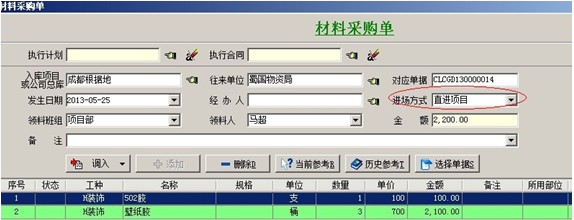 2. 【材料采購單】也稱為:材料驗收單、材料入庫單,是材料采購時,材料到達現(xiàn)場后要填寫的單據(jù)。在單據(jù)填寫時進場方式分為:采購入庫和直進項目。與其他入庫單相同,進場方式選擇直進項目時,明細中的材料金額會直接進入單據(jù)所選的項目成本中。