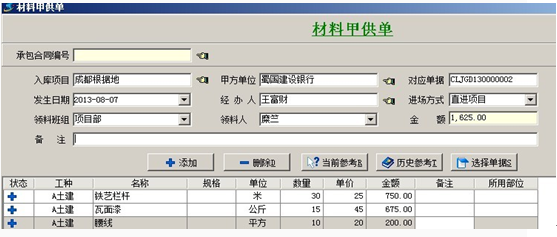 1. 【材料甲供單】這張單據(jù),是在甲供材料入場時填寫的業(yè)務單據(jù),填寫單據(jù)時,進場方式選擇直進項目,則該批材料會直接進入項目甲供成本。