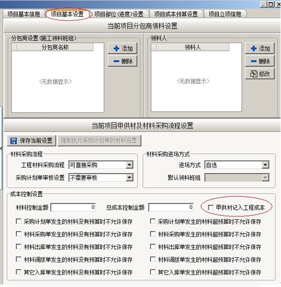 (二)、甲供材料,是項目所用材料由甲方公司提供。在默認情況下甲供材不會統(tǒng)計入項目成本,如果用戶希望甲供材統(tǒng)計入項目成本,必須在項目維護中把相關開關打開,如下圖: