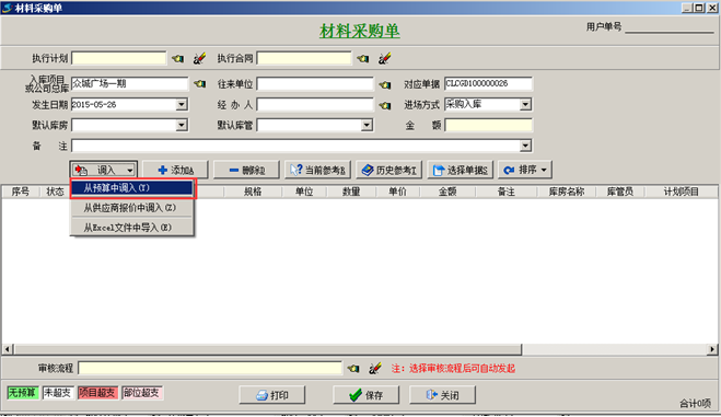 第二步,工程項(xiàng)目材料預(yù)算綁定好之后,在進(jìn)行材料采購的時(shí)候可根據(jù)預(yù)算調(diào)入采購材料。如果采購量超出預(yù)算量,系統(tǒng)會(huì)給出對(duì)應(yīng)的預(yù)警提示,如圖: