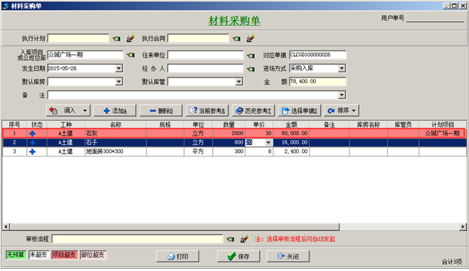 注:采購材料無預(yù)算時(shí)材料信息顯示綠色;未超支時(shí)無顏色顯示;項(xiàng)目超支時(shí)紅色顯示;部位超支粉紅色顯示。