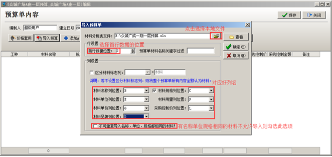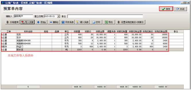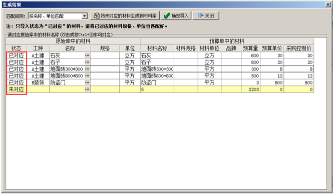 第三步,列名對(duì)應(yīng)好之后點(diǎn)擊[確定],將本地Excel中的內(nèi)容導(dǎo)入到系統(tǒng)中,如果預(yù)算單中存在與原始庫中未對(duì)應(yīng)的材料,可對(duì)應(yīng)之后[確定導(dǎo)入](對(duì)應(yīng)好之后后期如果有同樣的材料出現(xiàn)可自動(dòng)對(duì)應(yīng)),確定導(dǎo)入之后,文件中的內(nèi)容導(dǎo)入到系統(tǒng)中,點(diǎn)擊[保存]按鈕保存當(dāng)前材料預(yù)算單,如圖: