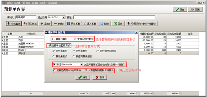 在進(jìn)行材料預(yù)算編輯時(shí),工程項(xiàng)目材料預(yù)算的單價(jià)可套用歷史采購價(jià)價(jià)格。點(diǎn)擊“價(jià)格套用”,選擇好替換“預(yù)算價(jià)”或“采購控制價(jià)”,選擇單價(jià)套用方式,以及沒有對(duì)應(yīng)材料時(shí)的替換方式,替換完成之后點(diǎn)擊確定,系統(tǒng)按照選擇的條件將價(jià)格進(jìn)行替換。如圖: