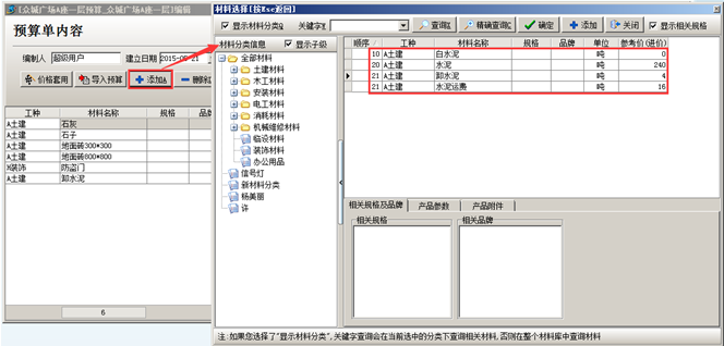 也可以點(diǎn)擊[添加]的按鈕,從材料庫中添加雨點(diǎn)材料到預(yù)算單中。點(diǎn)擊[添加]的按鈕,雙擊材料添加到預(yù)算單中,如圖: