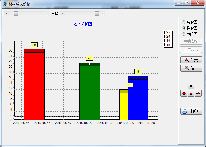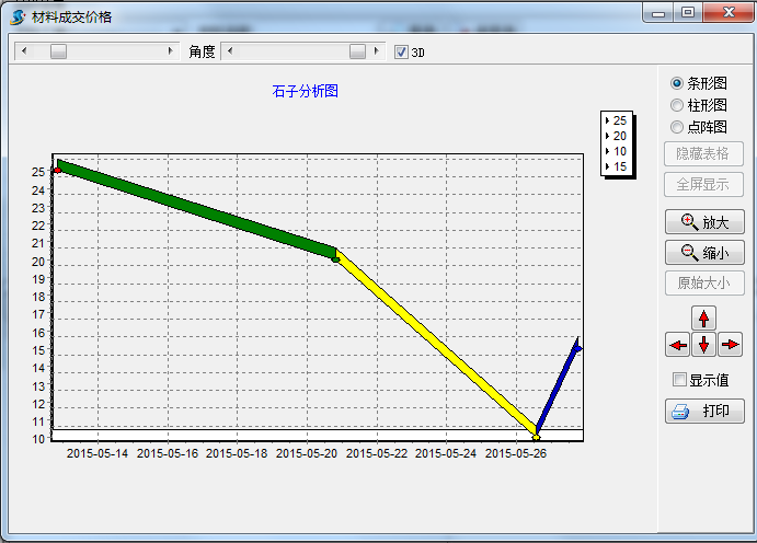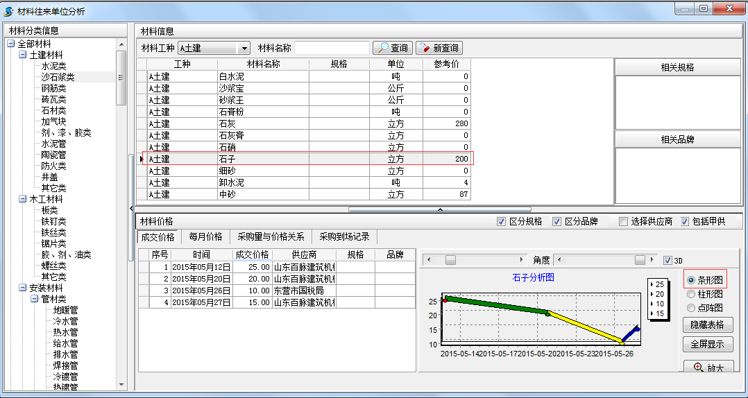 在工程項(xiàng)目管理系統(tǒng)中【材料成交價(jià)格分析圖】是用來查詢?cè)牧铣山粌r(jià)格的分析圖表,界面如下: