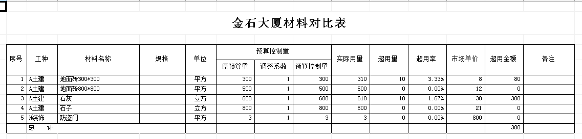 查詢結(jié)果如下圖:因?yàn)轫?xiàng)目【東營大廈二期】只有材料 【石灰】、【石子】和【地面磚330*330】的發(fā)生記錄。所以該項(xiàng)目上只能看到這兩個(gè)材料的對(duì)比結(jié)果。