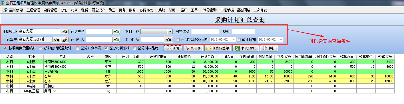 在工程項(xiàng)目管理系統(tǒng)中【采購計(jì)劃執(zhí)行匯總】 可以設(shè)置多重條件來匯總所有的【采購計(jì)劃單】的執(zhí)行情況,如下圖: