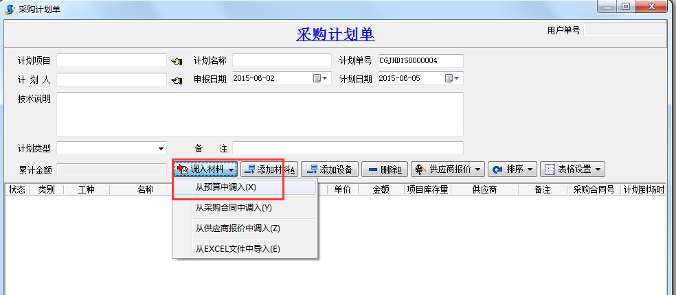 在工程項(xiàng)目管理系統(tǒng)中新建采購計(jì)劃單時(shí),添加材料內(nèi)容選擇從預(yù)算中調(diào)入,如下圖