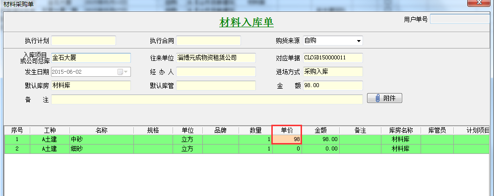我們對(duì)該合同進(jìn)行驗(yàn)收,生成材料采購單,如下圖