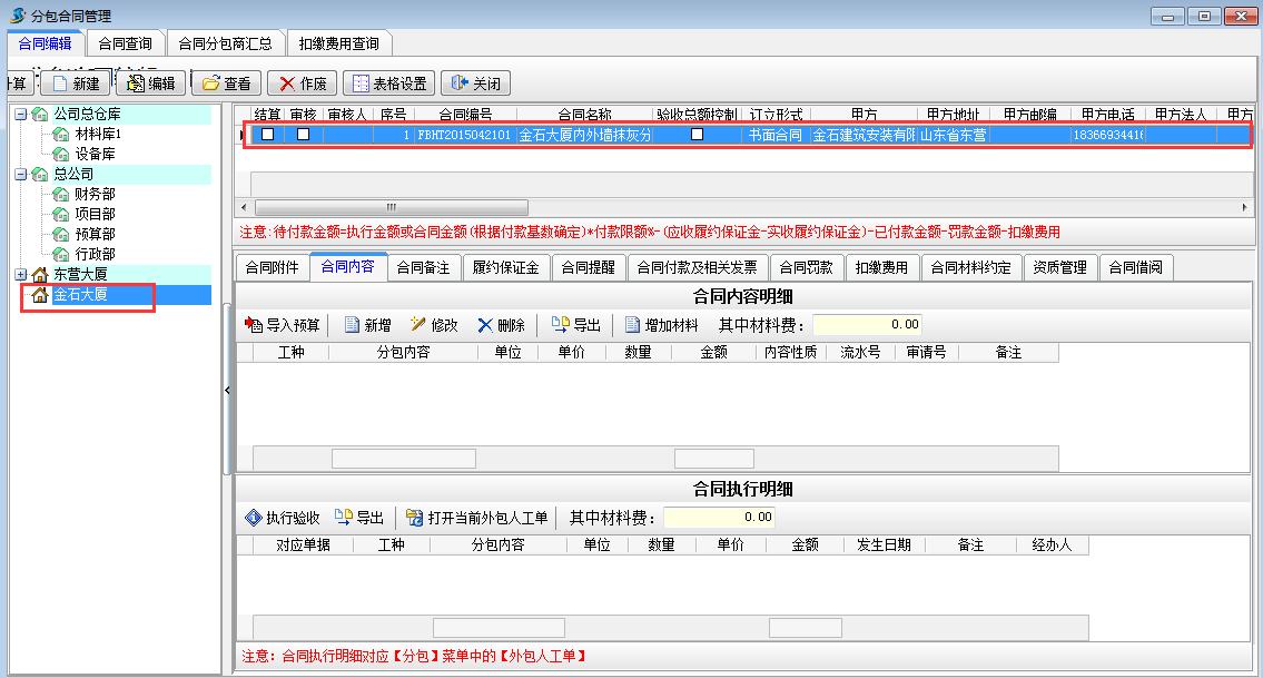 在【合同編輯】中左半部分是合同的分類,分包合同也是按【項目維護】進行分類管理的。一個項目下可以建立多個合同,窗口的右上部分是合同列表,一行信息代表一個合同。右下部位是當前合同相關(guān)的內(nèi)容:【合同附件】、【合同內(nèi)容】、【合同備注】、【履約保證金】、【合同提醒】、【合同付款及相關(guān)發(fā)票】、【合同罰款】、【扣繳費用】、【合同材料約定】、【資質(zhì)管理】、【合同借閱】。