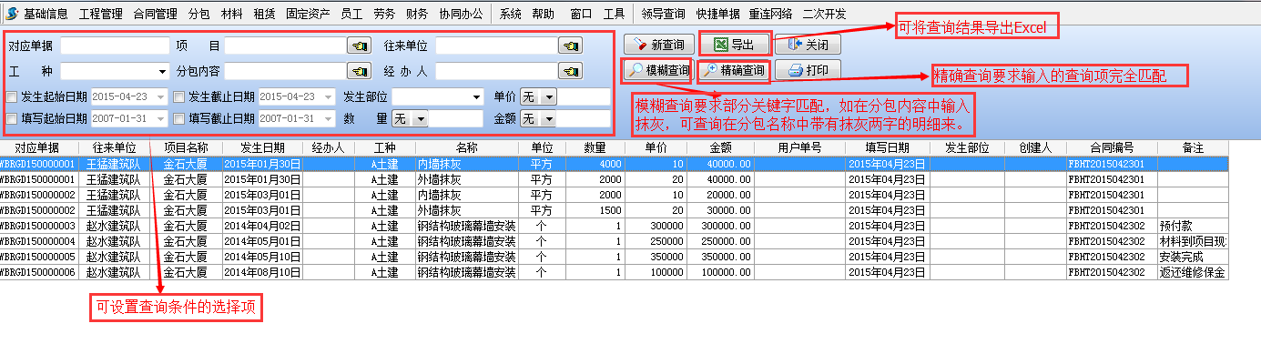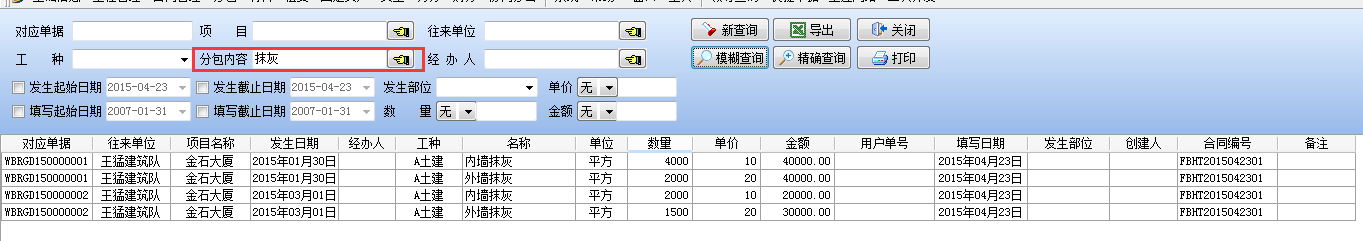 在分包內(nèi)容中輸入"抹灰"點擊【模糊查詢】后結(jié)果如下: