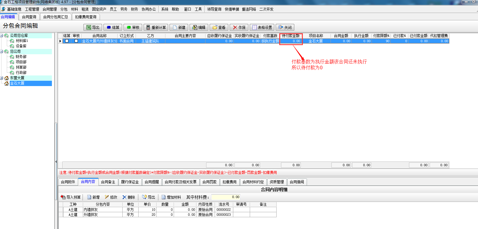 上圖帶紅框的注意填寫正確,其中帶*為必填項。尤其注意【付款基數(shù)】、【付款限額】這些項都會直接影響到該合同的待付款。
