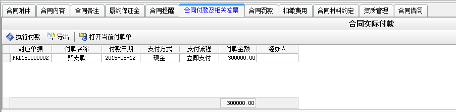 在合同付款及相關(guān)發(fā)票處點擊付款生成付款申請單,系統(tǒng)會自動提示你已有預付款。
