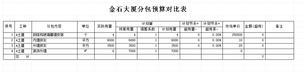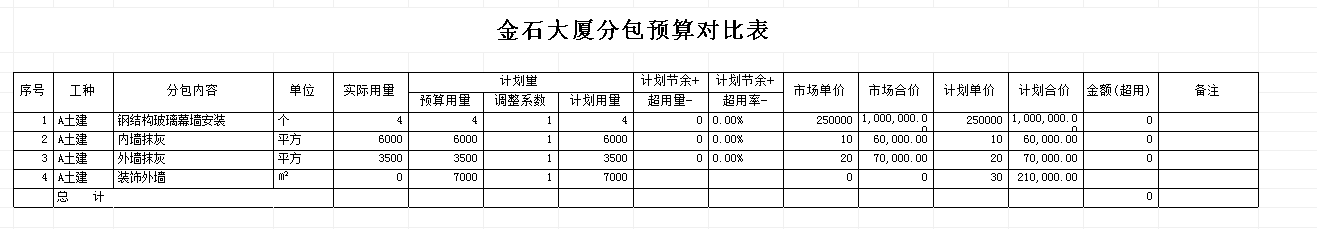 備注:調(diào)整系統(tǒng)說明:在實際的工程量投標中,某些施工企業(yè)為了中標而做低預算量,還有其它的原因如:一些分包根據(jù)以往的施工經(jīng)驗總會有一定的偏差。這里用調(diào)整系數(shù)是為了將最終要參與比較的【計劃用量】、【計劃用量】調(diào)整到接近于預期最真實的值。