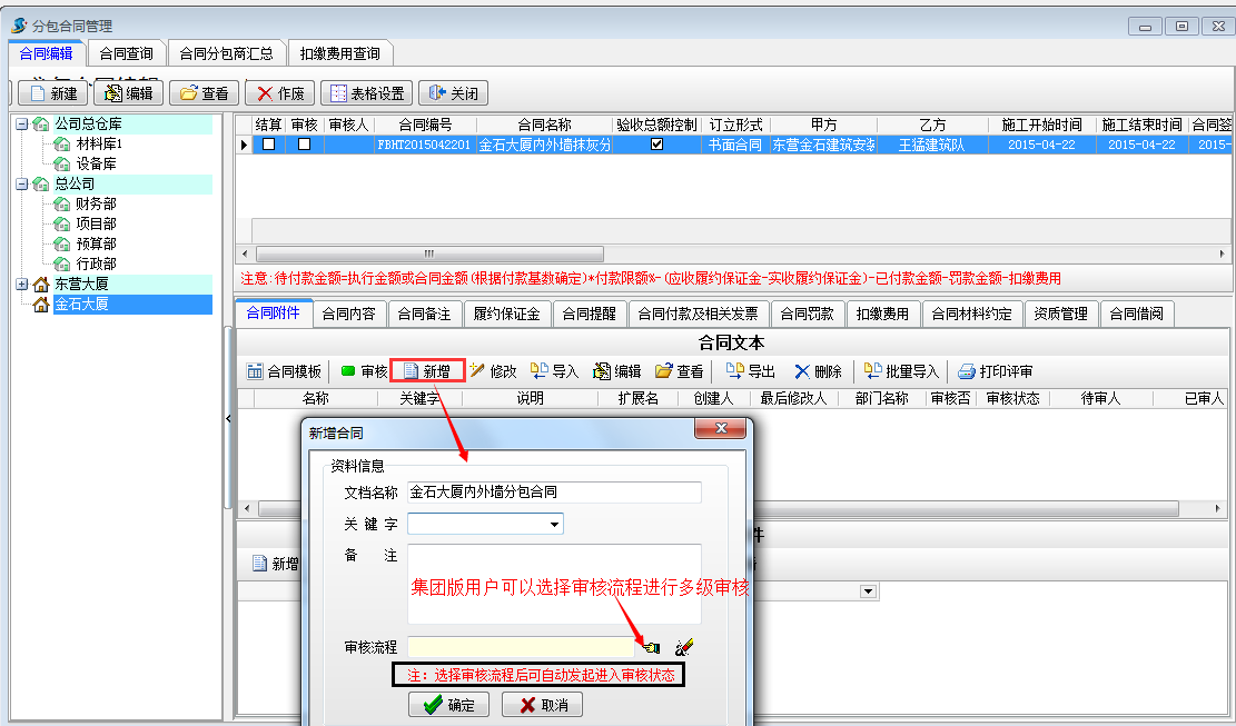 經(jīng)年底現(xiàn)場審核,確定完成內(nèi)墻4000平米,外墻2000平米,向施工隊付分包款,并扣除生活費。我們在合同內(nèi)容處選擇執(zhí)行驗收或者直接做外包人工單,外包人工單可進行多級審核.