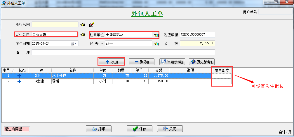 工程項目分包成本是根據(jù)外包人工單中項目名稱自動匯總統(tǒng)計到該項目。