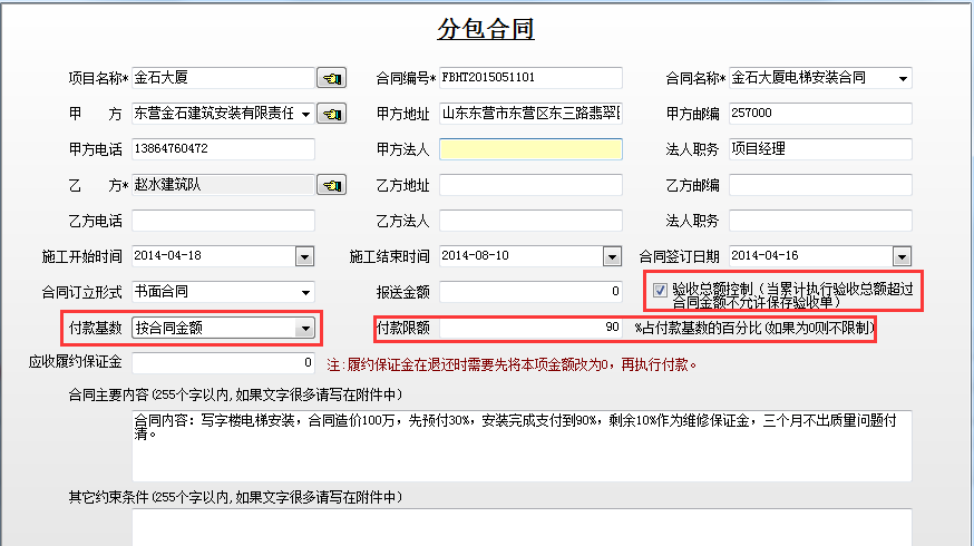 操作思路:合同內(nèi)容為寫字樓電梯安裝,不是按數(shù)量統(tǒng)計的,是一個總價,所以付款基數(shù)為按合同金額。因為最后要剩余10%作為維修保證金且周期比較長,所以付款限額設置成90%。第一次為預付款,第二次做外包人工單全部驗收,再付款到90%。三個月后退還維修保證金時,先在合同把付款限額改成0,再付最后的10%.