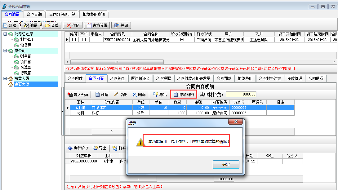 其中在包工包料而且材料單獨結(jié)算的情況下,可設置單獨的材料費。