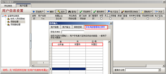 如果用戶有手機考勤管理地區(qū)授權(quán),則點擊“手機考勤管理地區(qū)授權(quán)”,輸入被授權(quán)的地址,則用戶會有權(quán)限查看被授權(quán)地區(qū)的員工考勤信息。