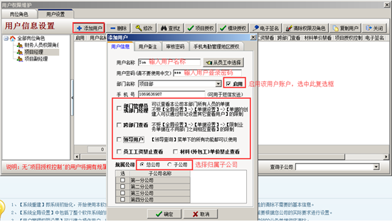 輸入用戶名稱(可從員工中選擇),輸入用戶“登錄密碼”,選擇“部門名稱”,啟用該用戶則可勾選“啟用”的復選框,可按照用戶的崗位及權(quán)限選擇對應(yīng)的查看權(quán)限,選擇用戶歸屬子公司。
