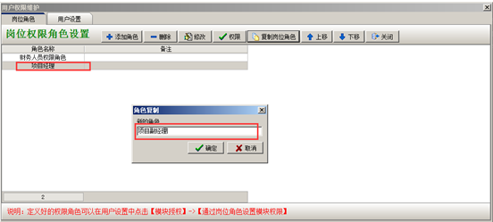 如果建立的新的崗位角色跟目前系統(tǒng)中現(xiàn)有的崗位角色擁有同樣的系統(tǒng)操作權(quán)限,可選中當前崗位角色,點擊“復制崗位角色”的按鈕,復制完成之后,新的崗位角色跟當前崗位角色擁有同樣的系統(tǒng)操作權(quán)限,如圖:
