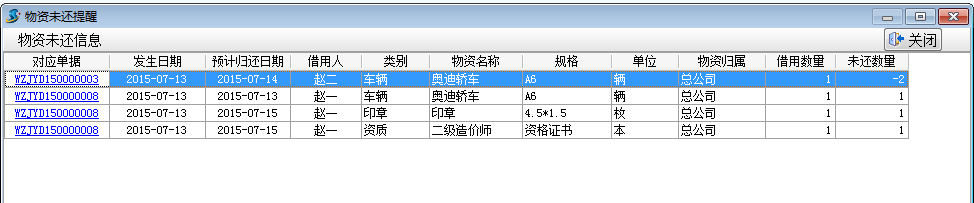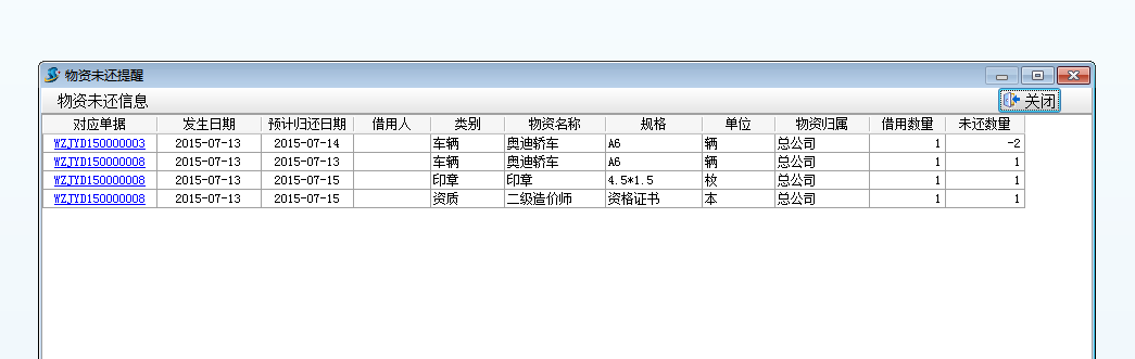 在填寫物資借用單時(shí),填寫好預(yù)計(jì)歸還日期,當(dāng)?shù)筋A(yù)計(jì)歸還日期時(shí),會(huì)自動(dòng)提醒物資未還信息。如下圖: