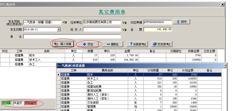 在單據(jù)中我們可以使用添加【按鈕】進行添加,也可以使用【調(diào)入預算】功能,從預算里面調(diào)入。另外在單據(jù)中有預警機制,如果添加預算外的內(nèi)容就明細會顯示綠色,超過預算的就會明細顯示紅色。