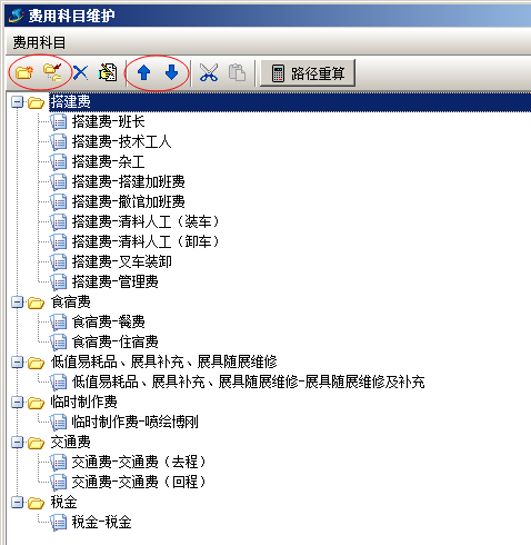 使用左上角圖標按鈕,創(chuàng)建費用科目,第一個按鈕的意思是新建平級科目,第二個按鈕是新建子級科目,按上下的箭頭可以調(diào)整上下位置,后面剪刀與文件代表的是復制與粘貼。