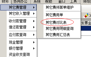 預算與實際對比,在財務(wù)菜單中第一項【其他費管理】,【其他費對比表】中查詢。