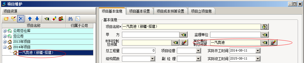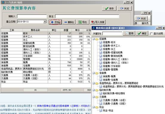在預算單中,點【添加】按鈕就會彈出之前設(shè)定好的科目,以供我們選擇使用。添加完成后,點保存按鈕進行保存。保存完成后,我們可以在工程管理模塊【項目維護】中進行預算與項目綁定。