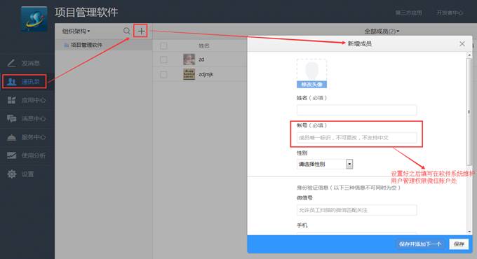 ⑵ 在微信企業(yè)號界面通訊錄模塊添加成員。如下圖: