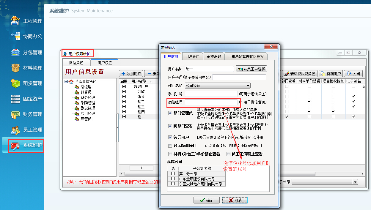 ⑶ 在金石軟件【系統(tǒng)維護】-【用戶管理權(quán)限設置】中設置每個使用用戶的微信賬號。如下圖: