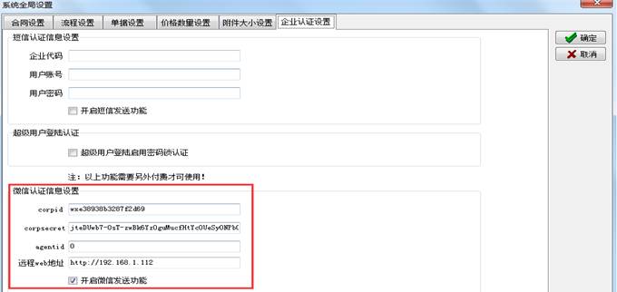 4. 獲取corpid, corpsecret和agentid好后登陸超級用戶在【系統(tǒng)維護】-【系統(tǒng)全局設置】-【企業(yè)認證設置】填寫微信認證信息。(此處需要開發(fā)商授權(quán))