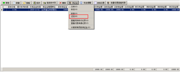 我方要從“保證金管理單位”將投標(biāo)保證金收回。工程管理軟件的項目開拓中選中對應(yīng)的項目,在“保證金”菜單中選擇“收回”,如圖所示:
