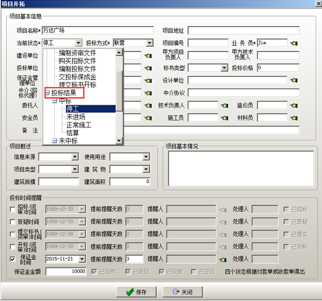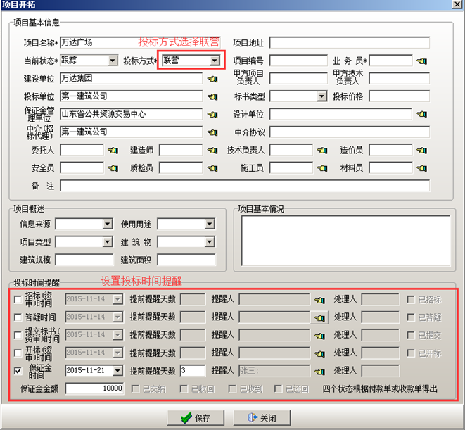 項目狀態(tài)編輯維護完成之后可在工程管理軟件中建立項目。在工程管理軟件的“項目開拓”中輸入包括個往來單位以及負責(zé)人等項目基本信息。也可在投標(biāo)時間提醒里面設(shè)置“招標(biāo)(資審)時間”,“答疑時間”,“提交標(biāo)書時間”,“開標(biāo)時間”,“保證金”提醒時間,時間設(shè)置完成之后,被提醒的用戶會在相應(yīng)的時間收到相關(guān)的提醒內(nèi)容。投標(biāo)保證金,在投標(biāo)保證金對應(yīng)的復(fù)選框打鉤,設(shè)置投標(biāo)保證金的時間,提前提醒的天數(shù),被提醒人以及金額。如圖所示: