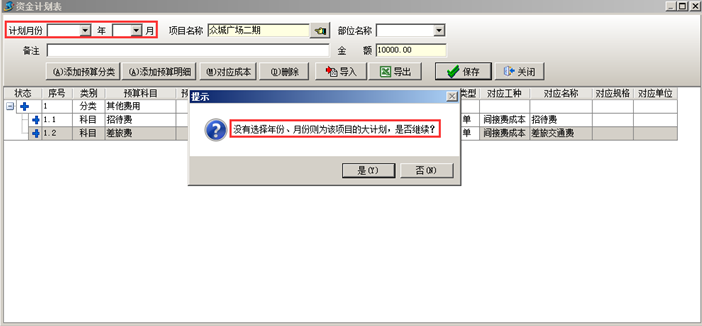 在工程管理軟件的資金計(jì)劃單中若選擇計(jì)劃月份,則資金計(jì)劃表為本項(xiàng)目當(dāng)月的資金計(jì)劃,若不填月份,則資金計(jì)劃表默認(rèn)為本項(xiàng)目的總的預(yù)算,工程管理軟件會給出相應(yīng)的提示。如圖: