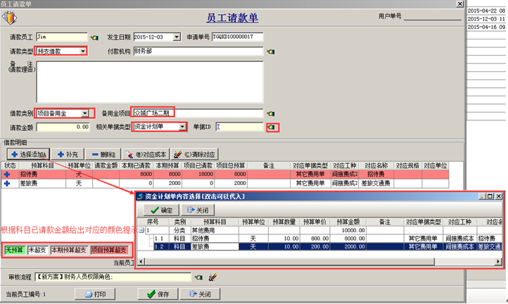 注:預(yù)算明細(xì)添加到請款單中,則系統(tǒng)會自動計(jì)算當(dāng)前項(xiàng)目在對應(yīng)預(yù)算科目下的已借款金額,對比資金計(jì)劃單中的預(yù)算金額,以不同的顏色提示用戶是否超支(本期預(yù)算超支或項(xiàng)目預(yù)算超支)。如圖: