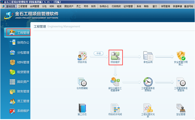首先在金石工程管理軟件“工程管理”的“項(xiàng)目維護(hù)”中,在公司節(jié)點(diǎn)下建立“生產(chǎn)車間”并設(shè)立對(duì)應(yīng)庫(kù)房,這樣便于對(duì)用于生產(chǎn)的原材料或者產(chǎn)品進(jìn)行管理。如圖: